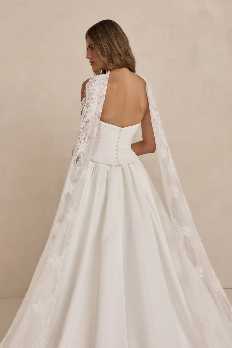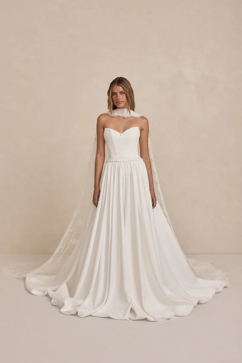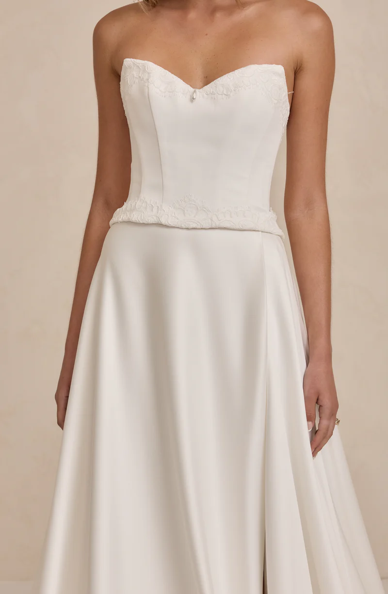 Cut in a straight, slightly longer shape, Rylee sits between a classic bodice and a shorter peplum, perfect for those drawn to Tanner’s silhouette but looking for a little more length. A thoughtful option for modern brides seeking clean structure with romantic detailing.